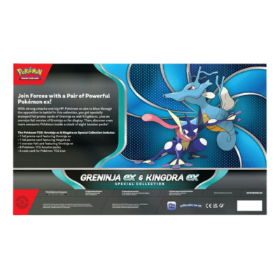 Join Forces with a Pair of Powerful Pokémon ex! With strong attacks and big HP, Pokémon ex aim to blow through the opposition in battle! In this collection, you get specially stamped foil promo cards of Greninja ex and Kingdra ex, plus an oversize foil version of Greninja ex for display. Then, discover even more awesome Pokémon inside a stack of eight booster packs!